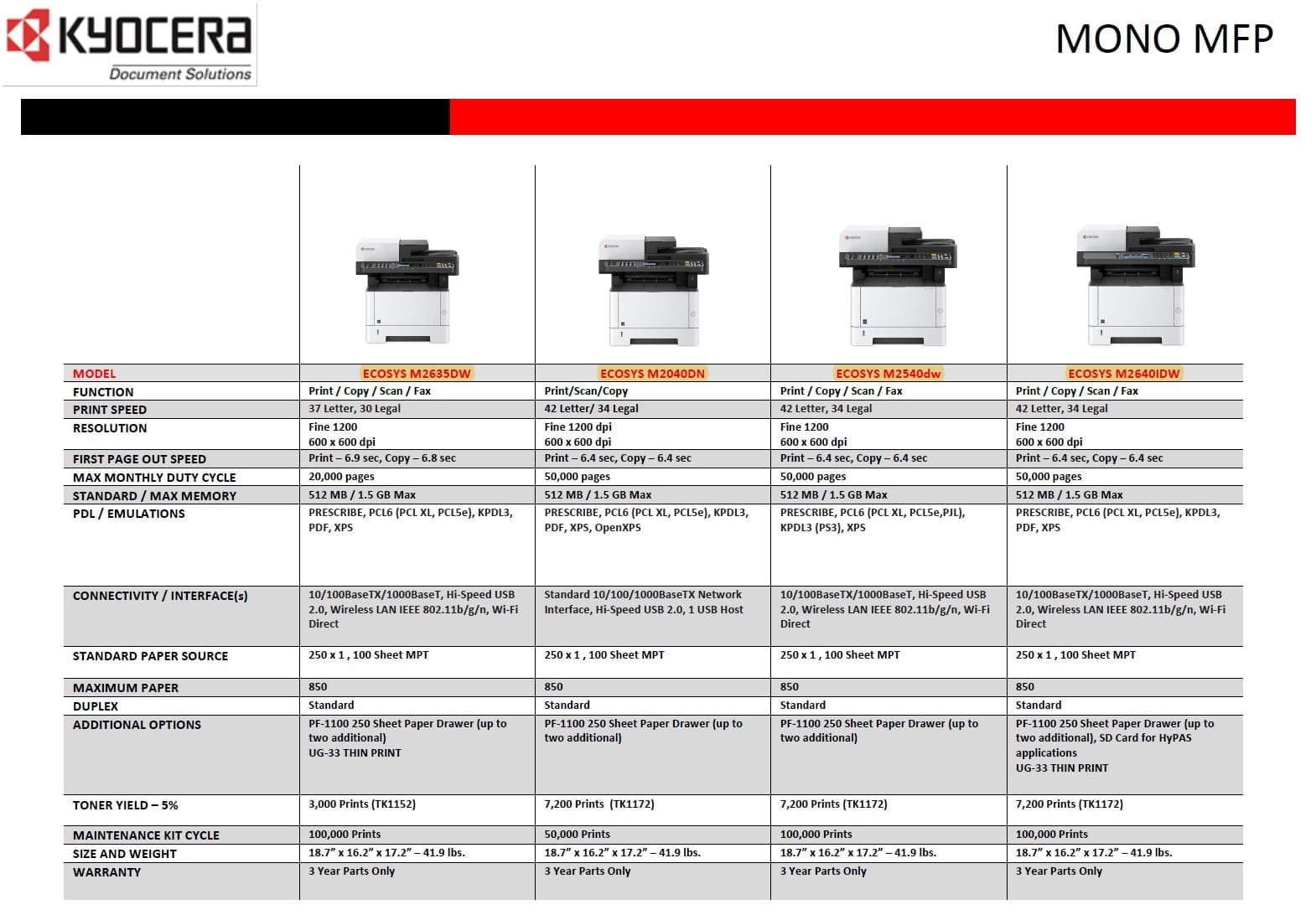 The ECOSYS M2635dw monochrome multifunctional printer brings advanced features and proven productivity to the budget conscious business. Its ease-of-use design offers exceptional print quality, reliability, and low TCO, with ECOSYS long life consumables for maximum uptime. On-The-Go printing and scanning capabilities and wireless functionality enable workgroups of all sizes to easily drive their business from anywhere. Solid performance with print speeds up to 37 ppm, advanced security features and convenient walk-up USB accessibility, the ECOSYS M2635dw can affordably take your business processes to the next level.