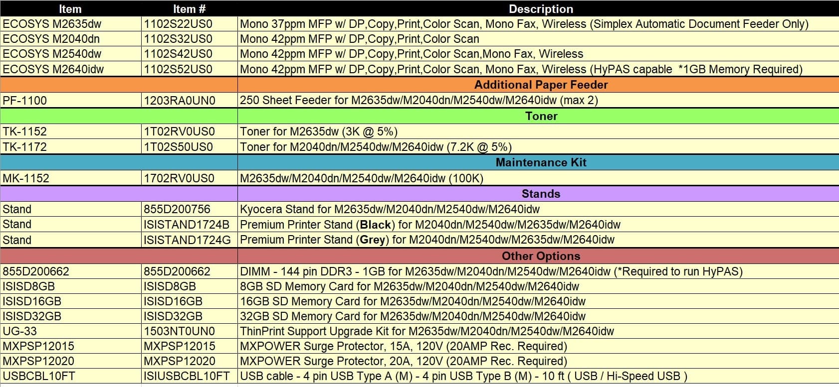We recommend using only Kyocera Tone TK-1152 with printing yields of up to 3,000 pages. Need to print a lot of pages? Add up to two additional Sheet Feeder drawer (PF-1100) to the printer. Many more accessories are available. Search the M2635 in our search tool and a list of related items will show! Happy shopping!