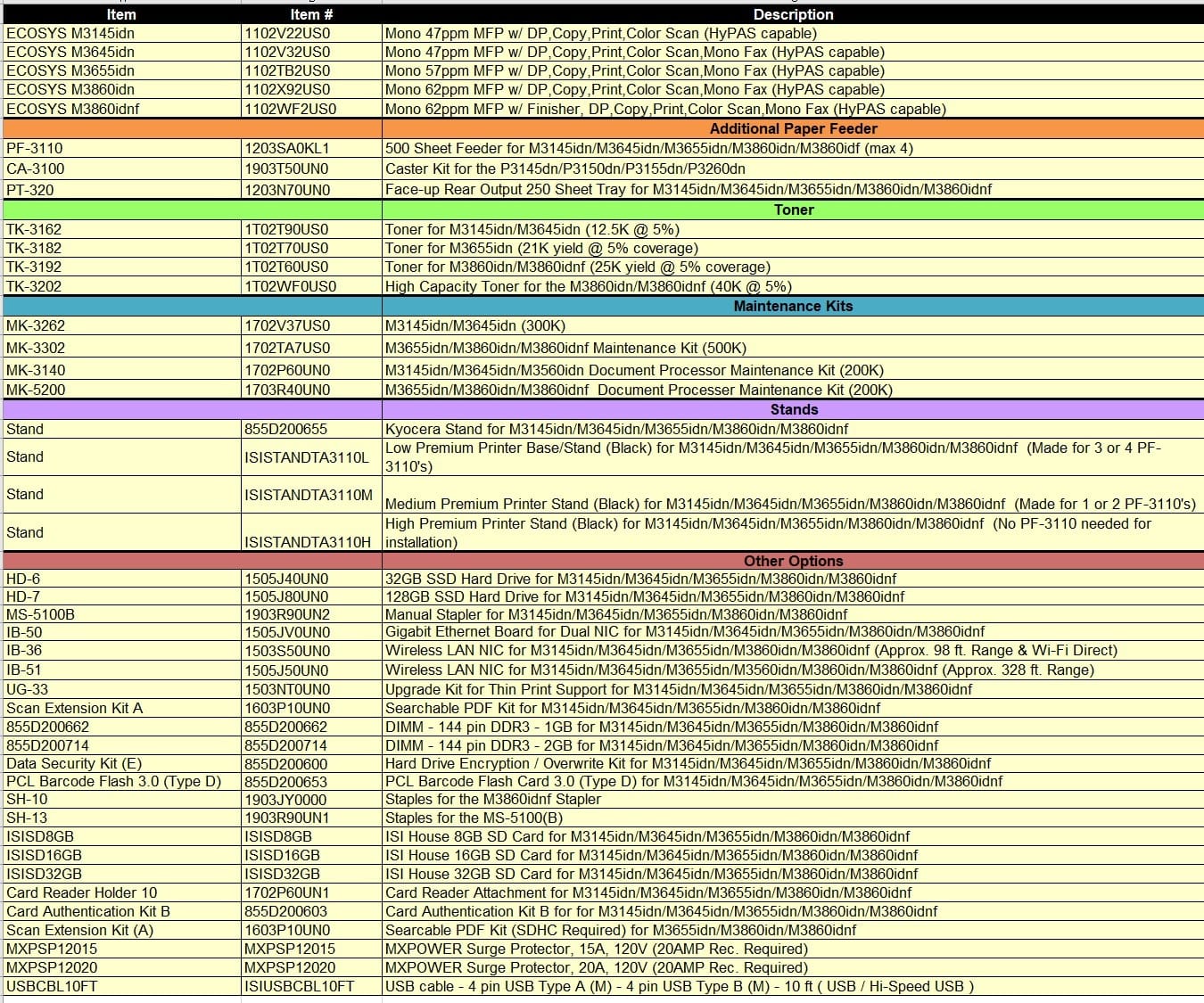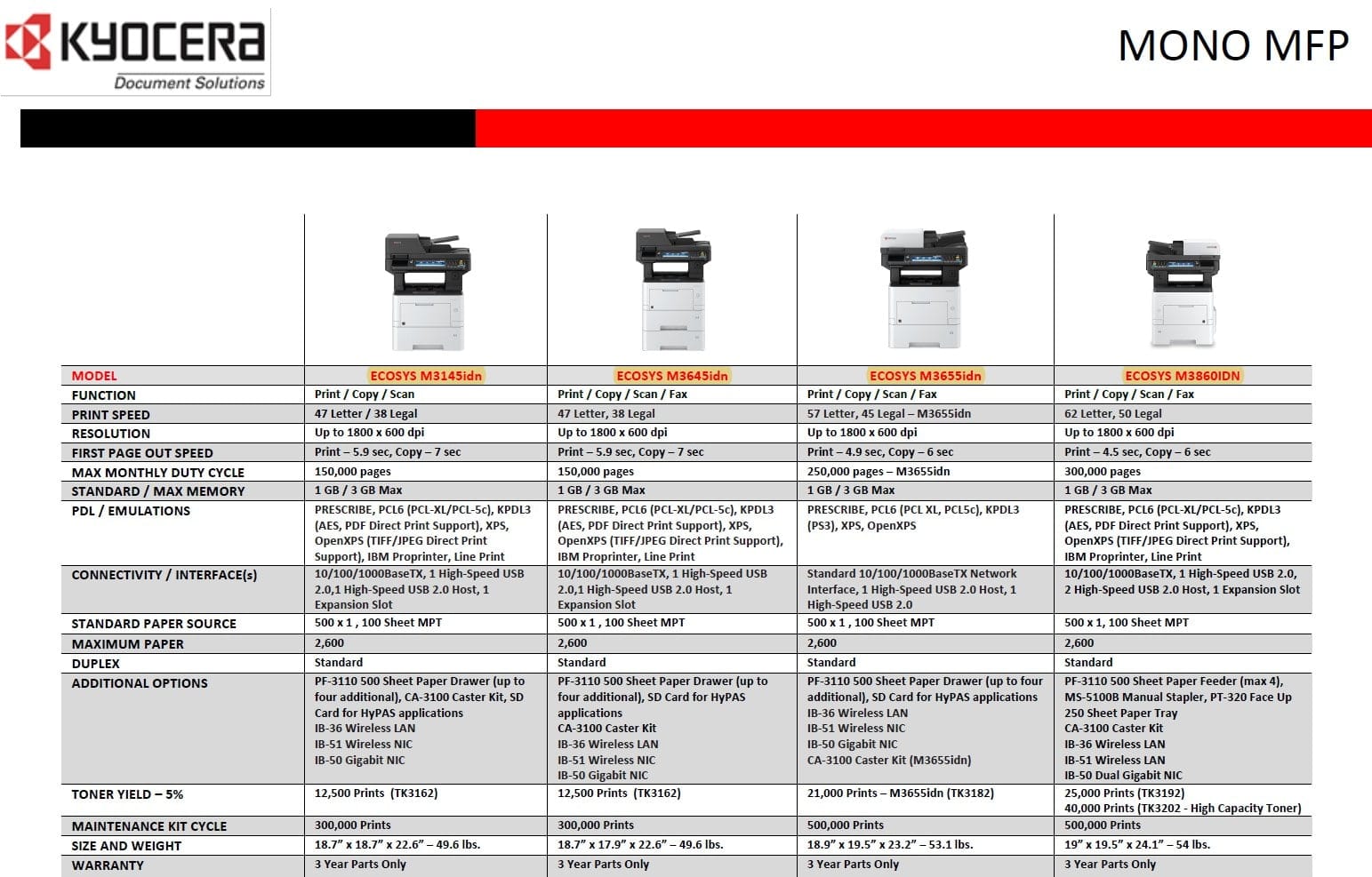 The ECOSYS M3655idn was created to meet the need for a black & white MFP that is small in size but big on features. At speeds up to 57 ppm, it offers impressive performance, with full print, copy, color scan and fax capabilities, exceptional print quality, standard Dual Scan Document Processor, high paper capacity, and features and functionality accessible from a tablet-like 7″ color touch screen interface. Business applications drive productivity with secure mobile printing and scanning, and solutions designed to fit your unique workflows. High yield consumables complete the picture, for a powerful desktop device with the low total cost of ownership your business deserves.