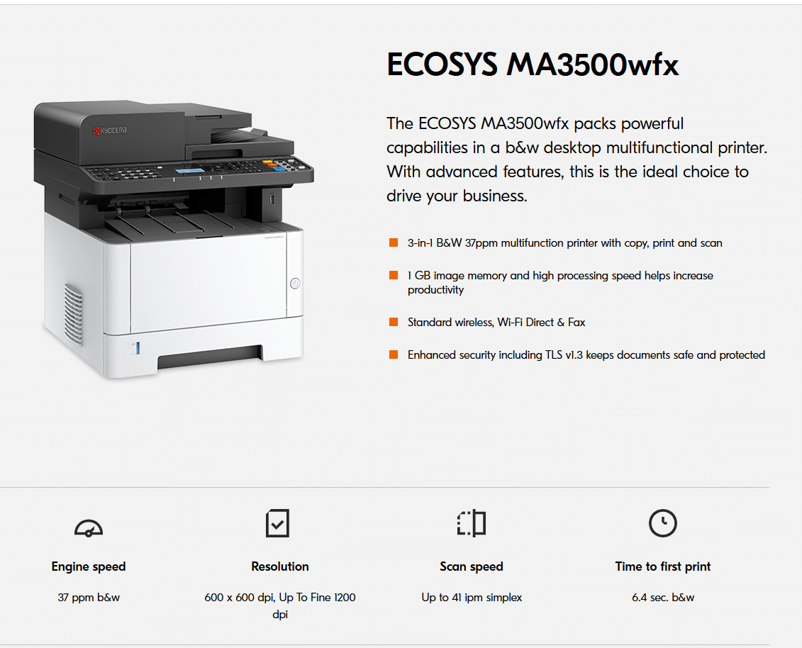 The Kyocera ECOSYS MA3500wfx is a highly efficient A4 monochrome multifunction printer designed for small to medium-sized businesses seeking powerful performance, versatility, and exceptional reliability. With print, copy, scan, and fax capabilities all integrated into a compact design, this device supports mobile workflows and secure document management with ease.
