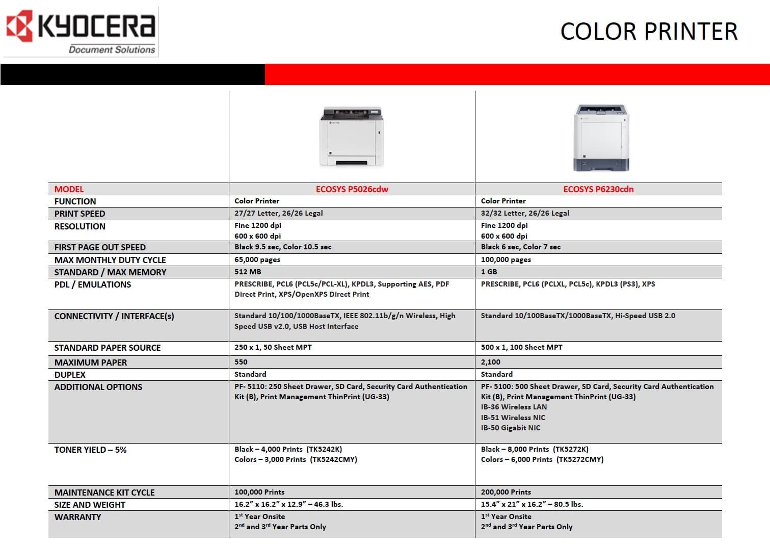 The ECOSYS P6230cdn, Color A4 (up to 8.5″ x 14″) printer brings impressive performance, at speeds up to 32 ppm, and advanced features to the desktop. With a paper capacity of up to 2,100 sheets, standard duplex, true 1200 x 1200 dpi print resolution and On-The-Go mobile print capability, it can easily handle the demands of today’s small-medium businesses and workgroups. Long life consumables, a low total cost of ownership, and exceptional reliability make it the affordable smart choice to drive your business needs.