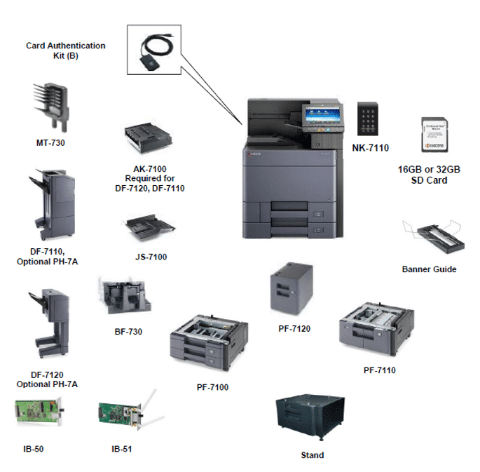 - 4,000-Sheet Finisher – Product Code: DF-7110 (with 65-sheet stapling, optional PH-7A punch, and support for additional modules)