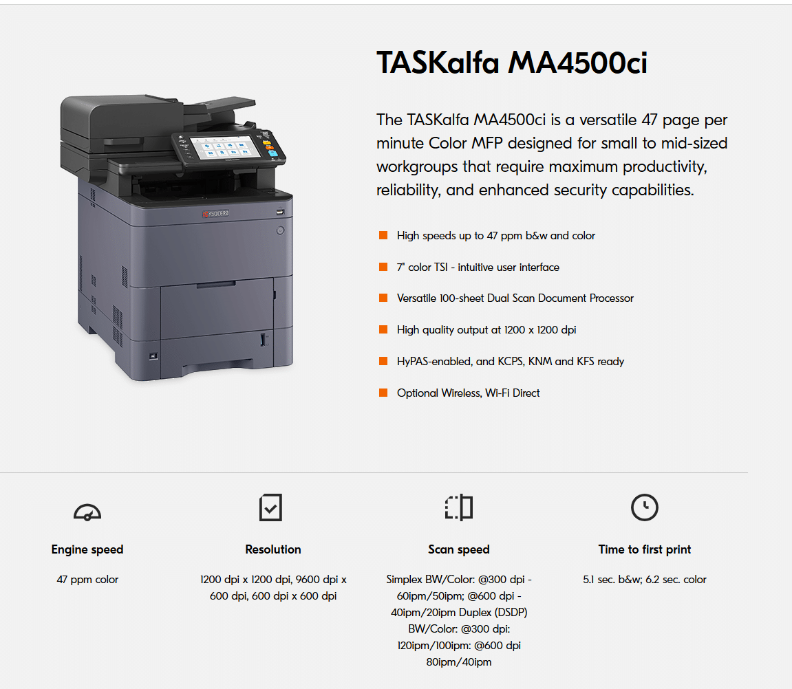 The TASKalfa MA4500ci is the ultimate solution for businesses looking to enhance their document management processes. With its superior speed, quality, and security features, it ensures that your office runs smoothly and efficiently while delivering professional results every time.