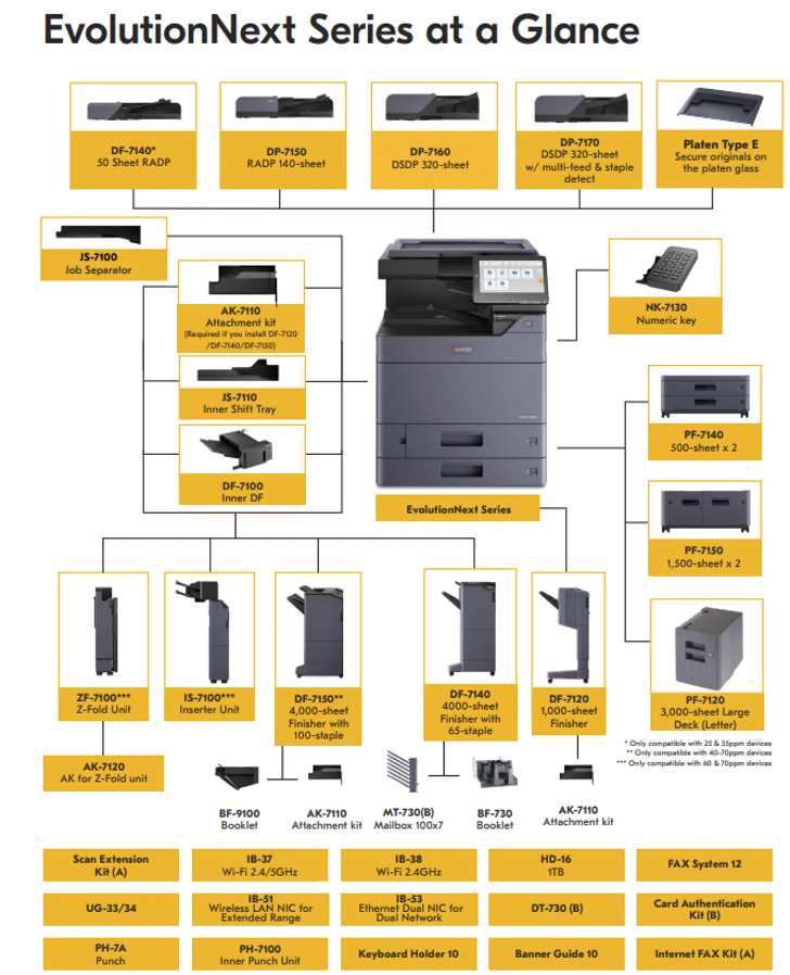 - 4,000 Sheet Finisher (DF-7140): Includes booklet fold, tri-fold, and multi-bin options